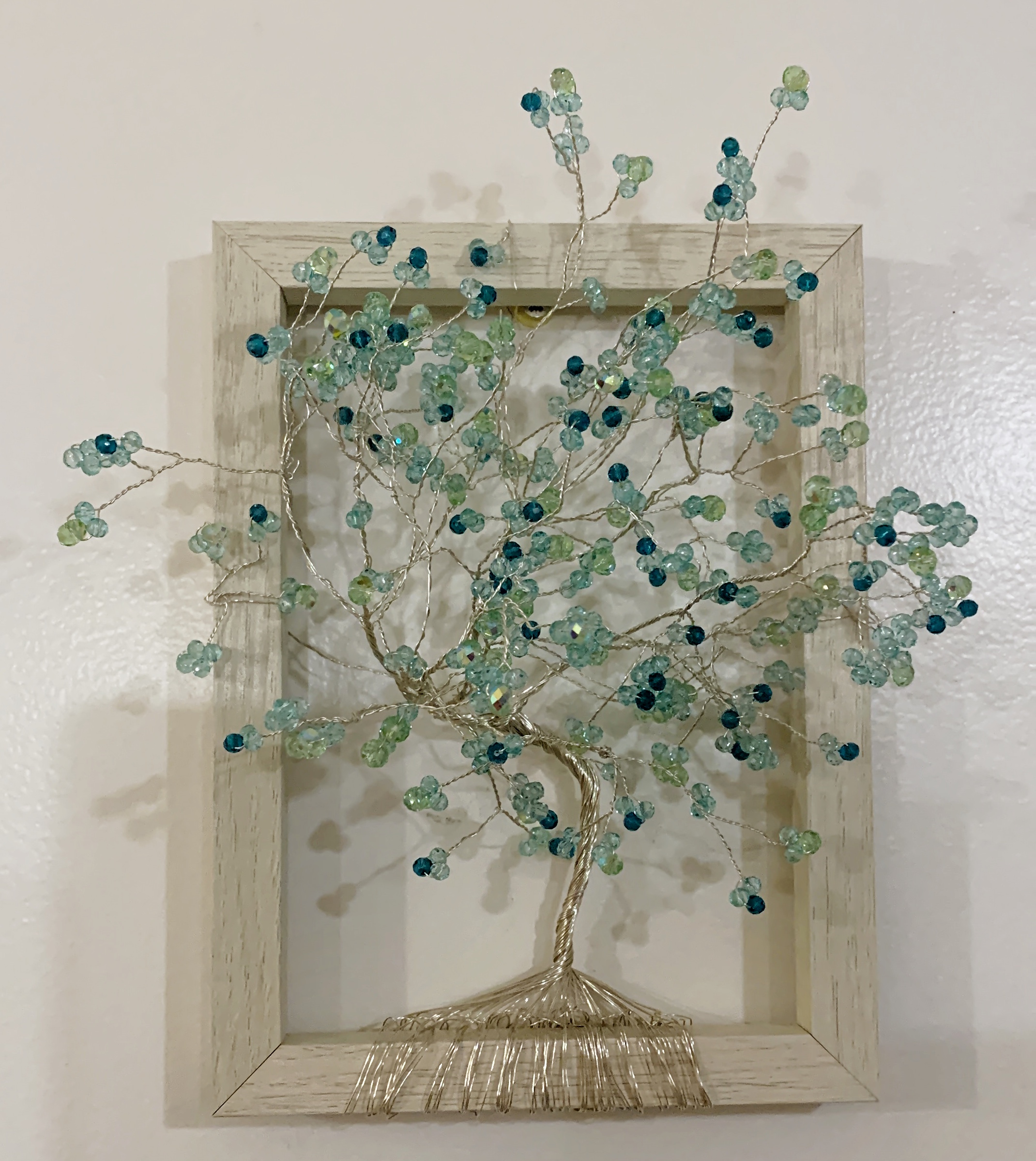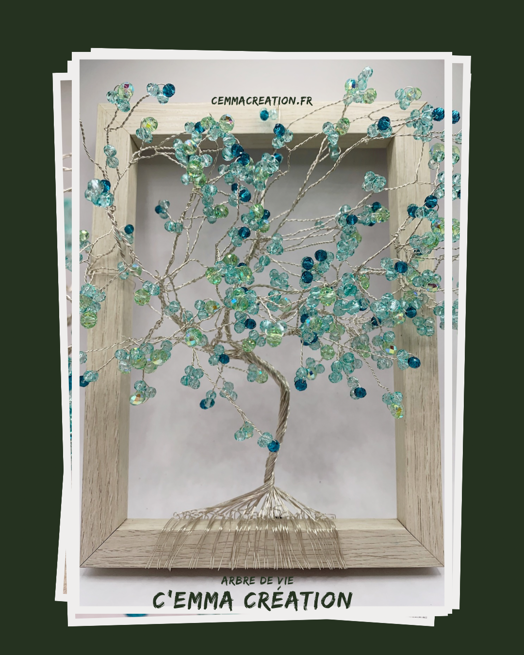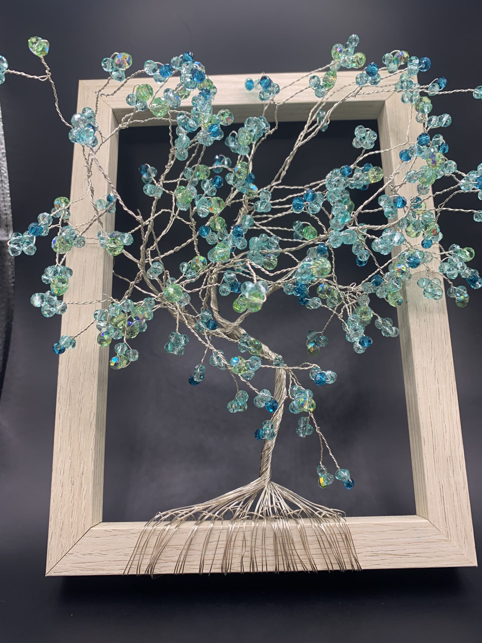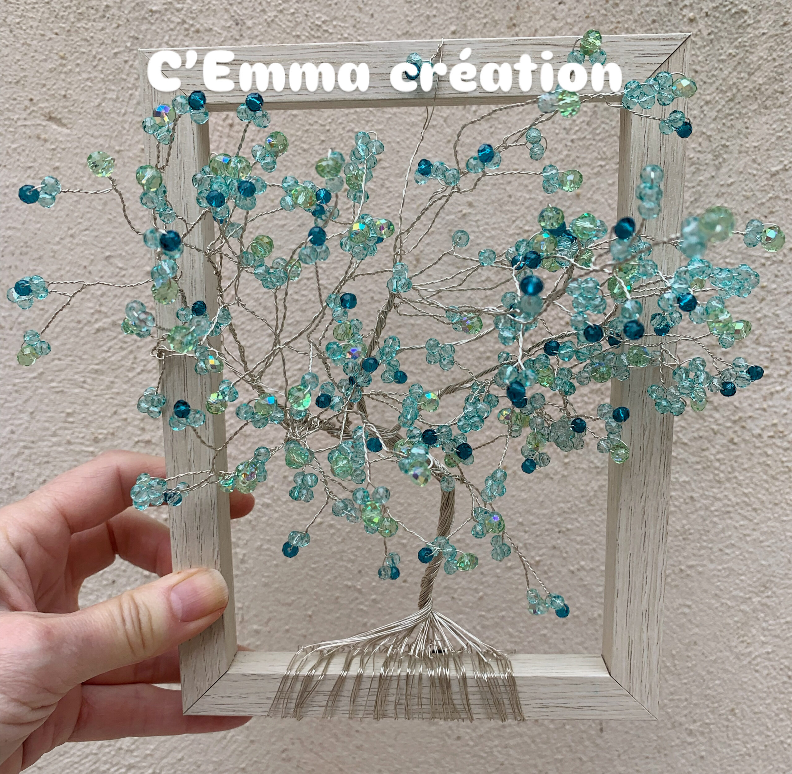 Tel un arbre figé dans le temps, ce cadre délicat mêle la finesse du fil à l’éclat cristallin de perles aux nuances turquoise et vert d’eau. Chaque branche semble danser, capturant la lumière et invitant au calme et à la rêverie.