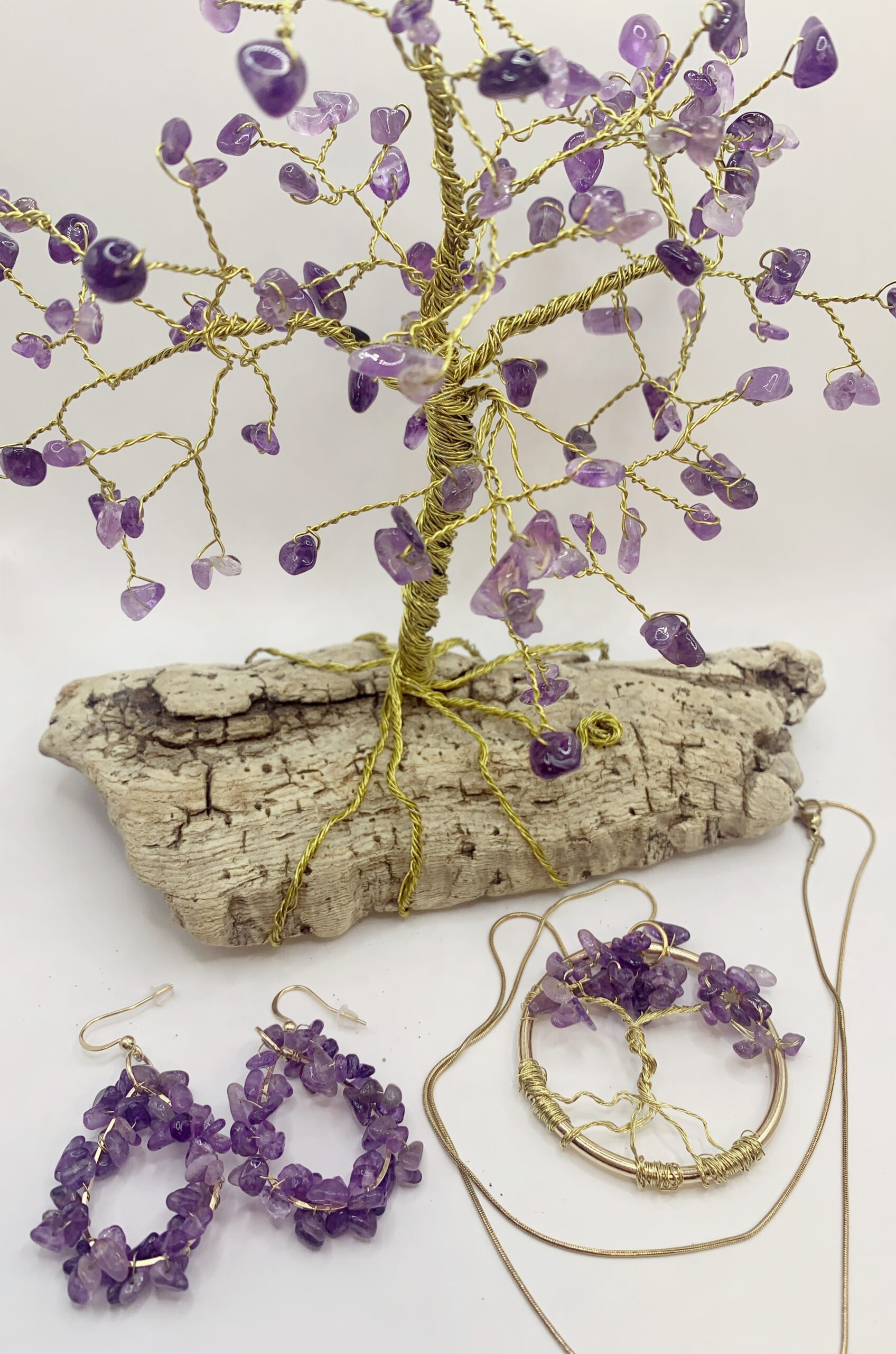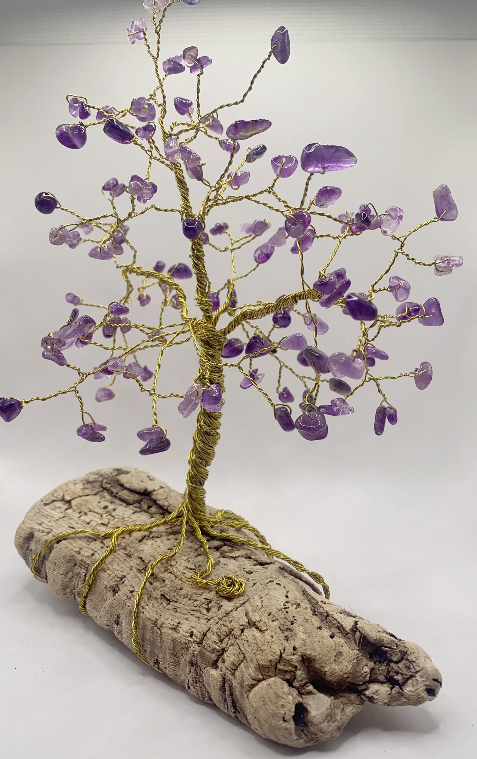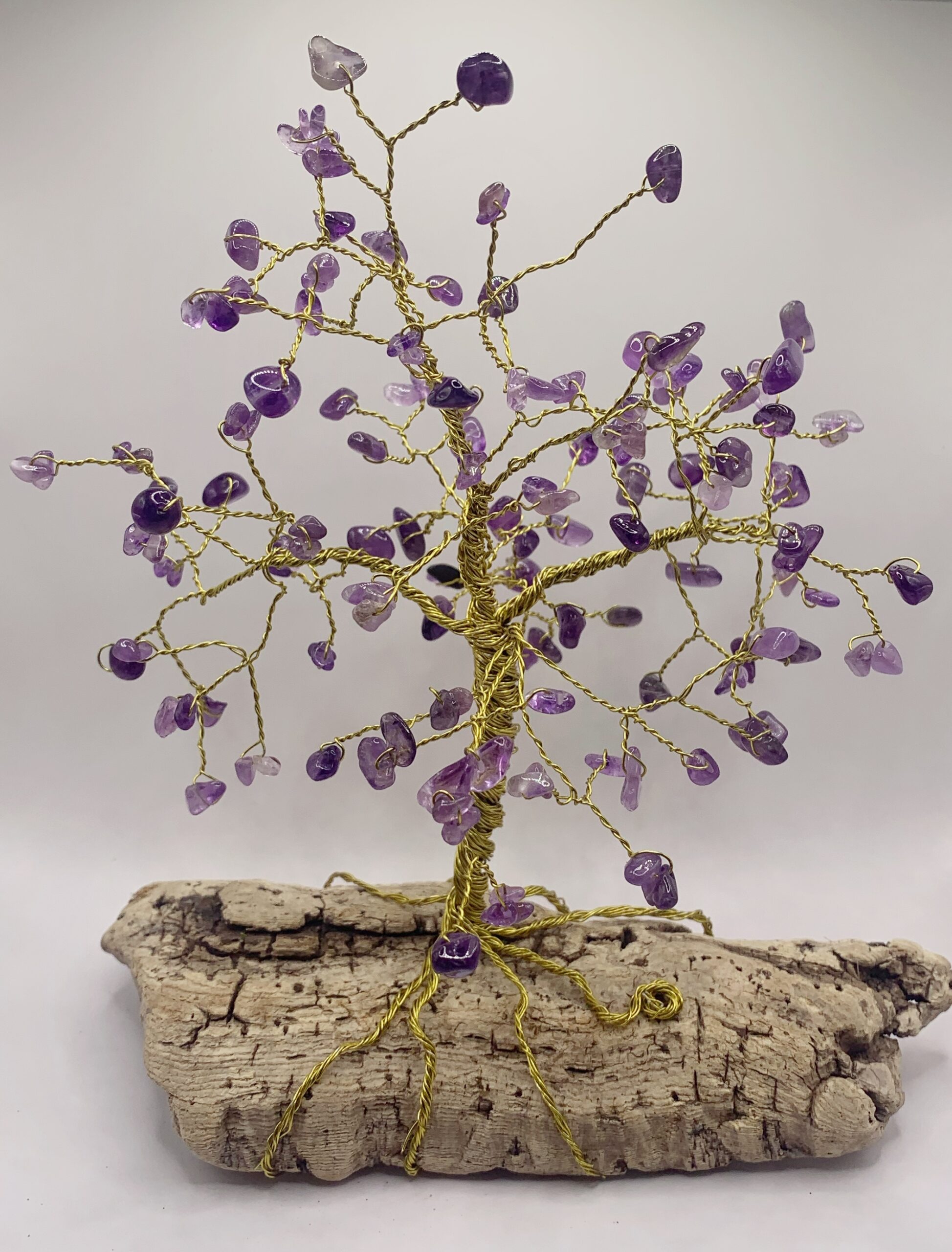 Les fines branches dorées de ce magnifique arbre de vie, délicatement torsadées, s’élèvent avec grâce et portent de véritables éclats d’améthyste aux reflets violets profonds. Chaque pierre capte la lumière et diffuse une énergie douce, apaisante et inspirante.
