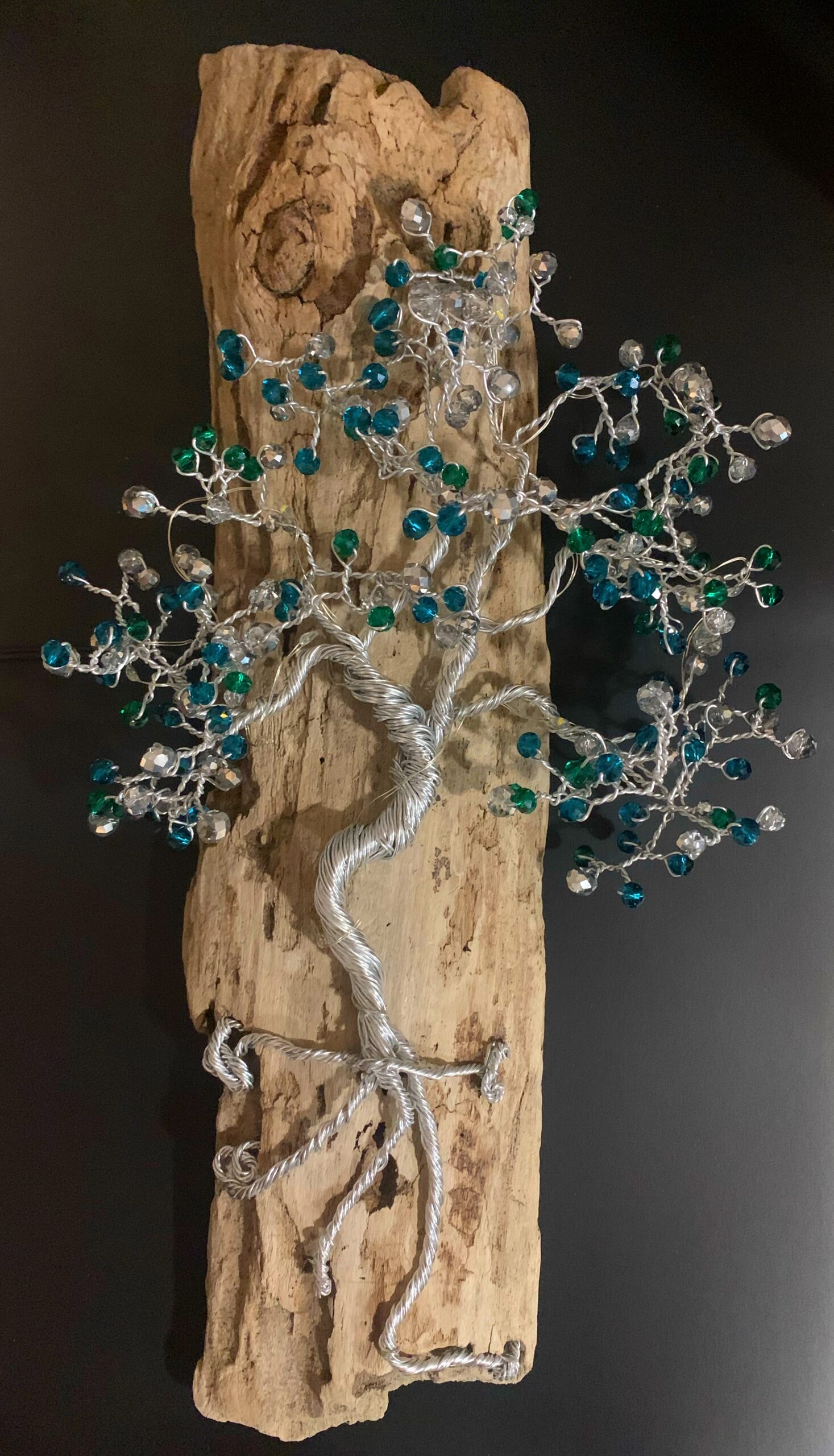 Symbole universel de connexion entre la Terre et le ciel, cet arbre de vie mural invite à l’ancrage, à l’équilibre et à la sérénité. Entièrement réalisé à la main, il incarne la force des racines, la fluidité du tronc et l’expansion de l’âme à travers ses branches délicatement déployées. Le bois flotté, porteur d’énergie et de stabilité, s’unit avec le fil d’aluminium torsadé, représentant le chemin de vie, parfois sinueux mais toujours ascendant. Les perles de verre aux teintes vert émeraude, bleu profond et cristal évoquent la guérison, la paix intérieure, la clarté de l’esprit et la protection. La lumière douce intégrée illumine l’arbre tel un souffle de vie, révélant une présence apaisante et bienveillante.
