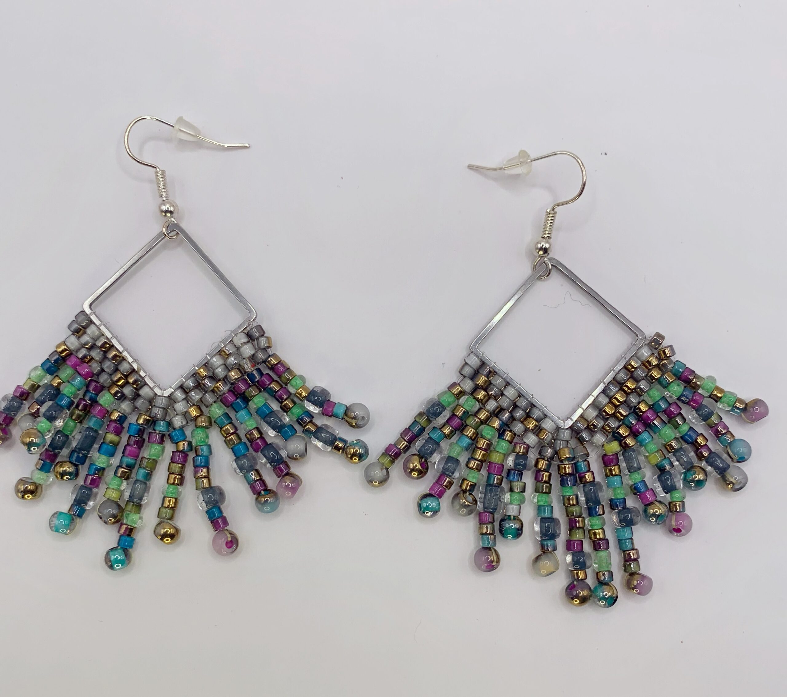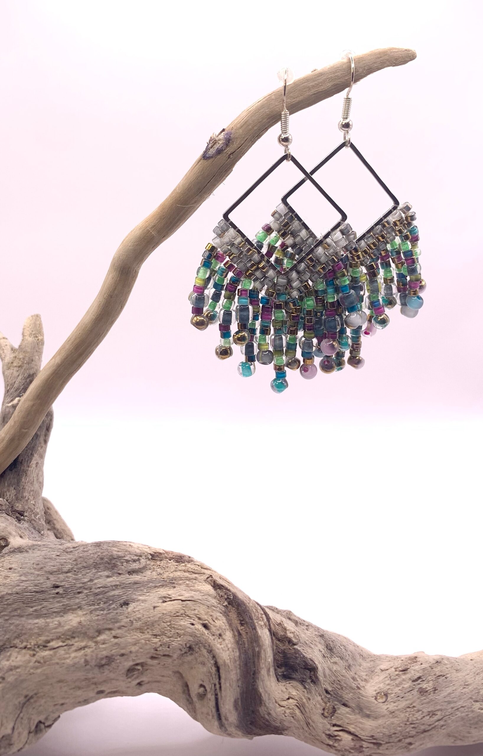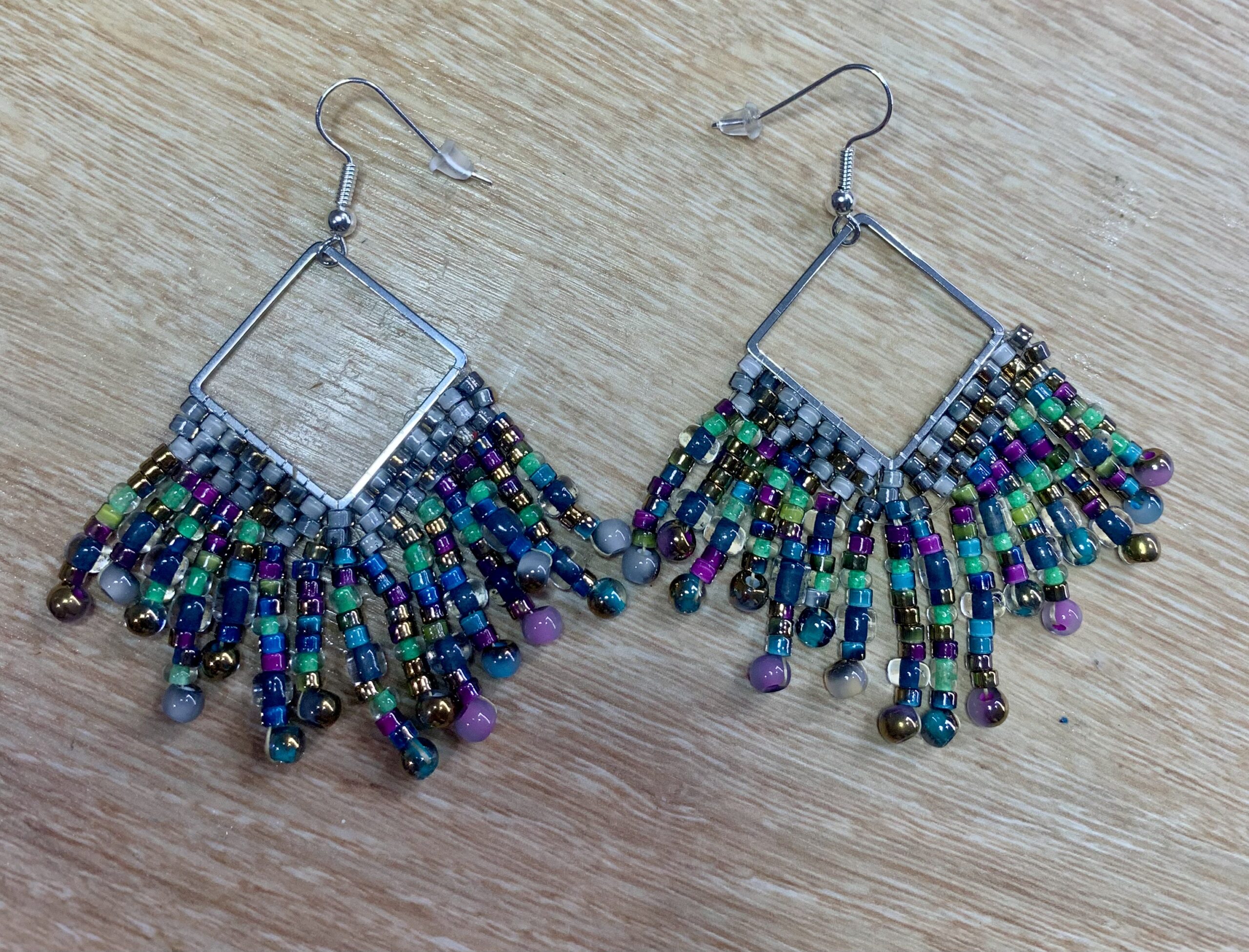 Composées de perles de rocailles dans les tons bleu/vert/doré.