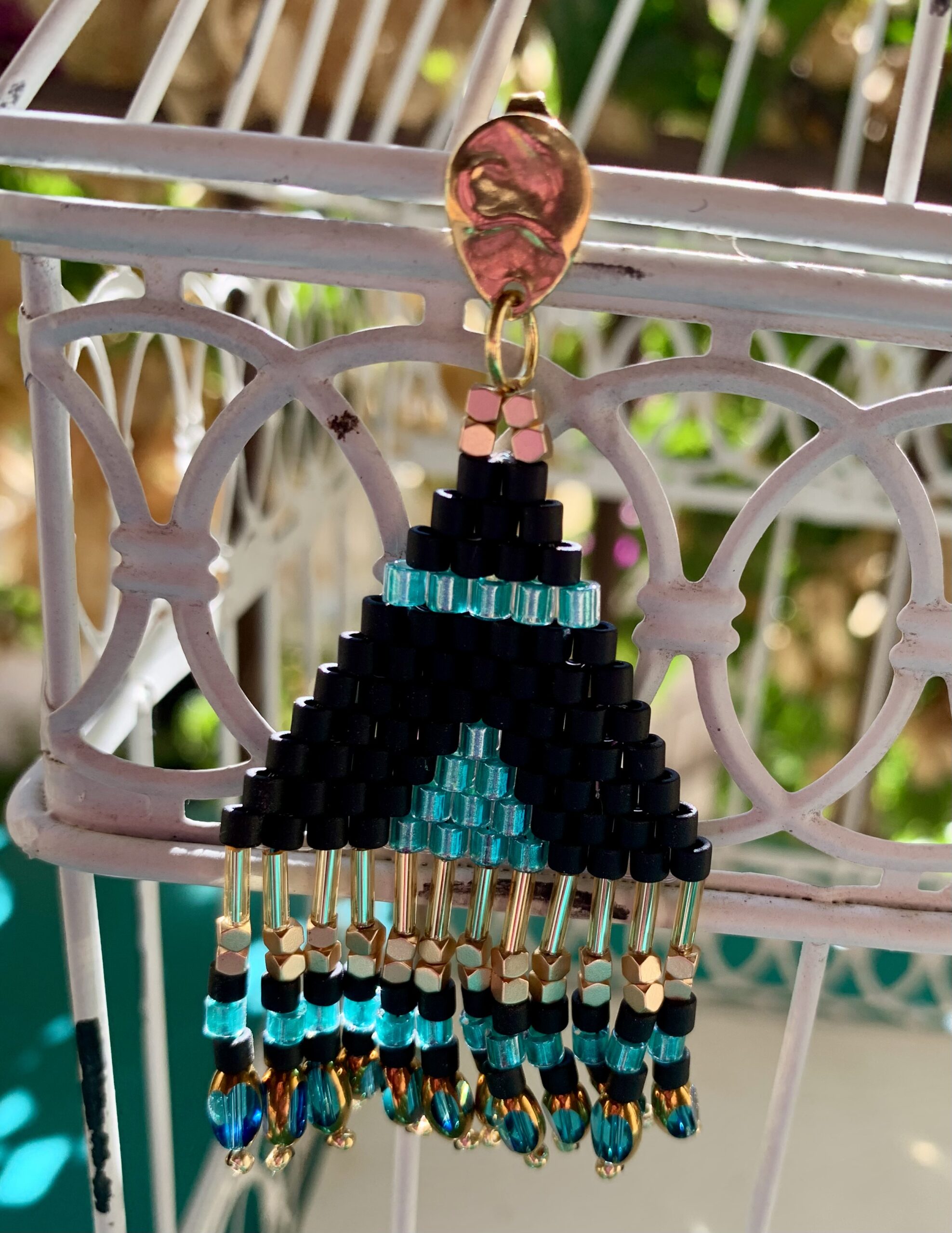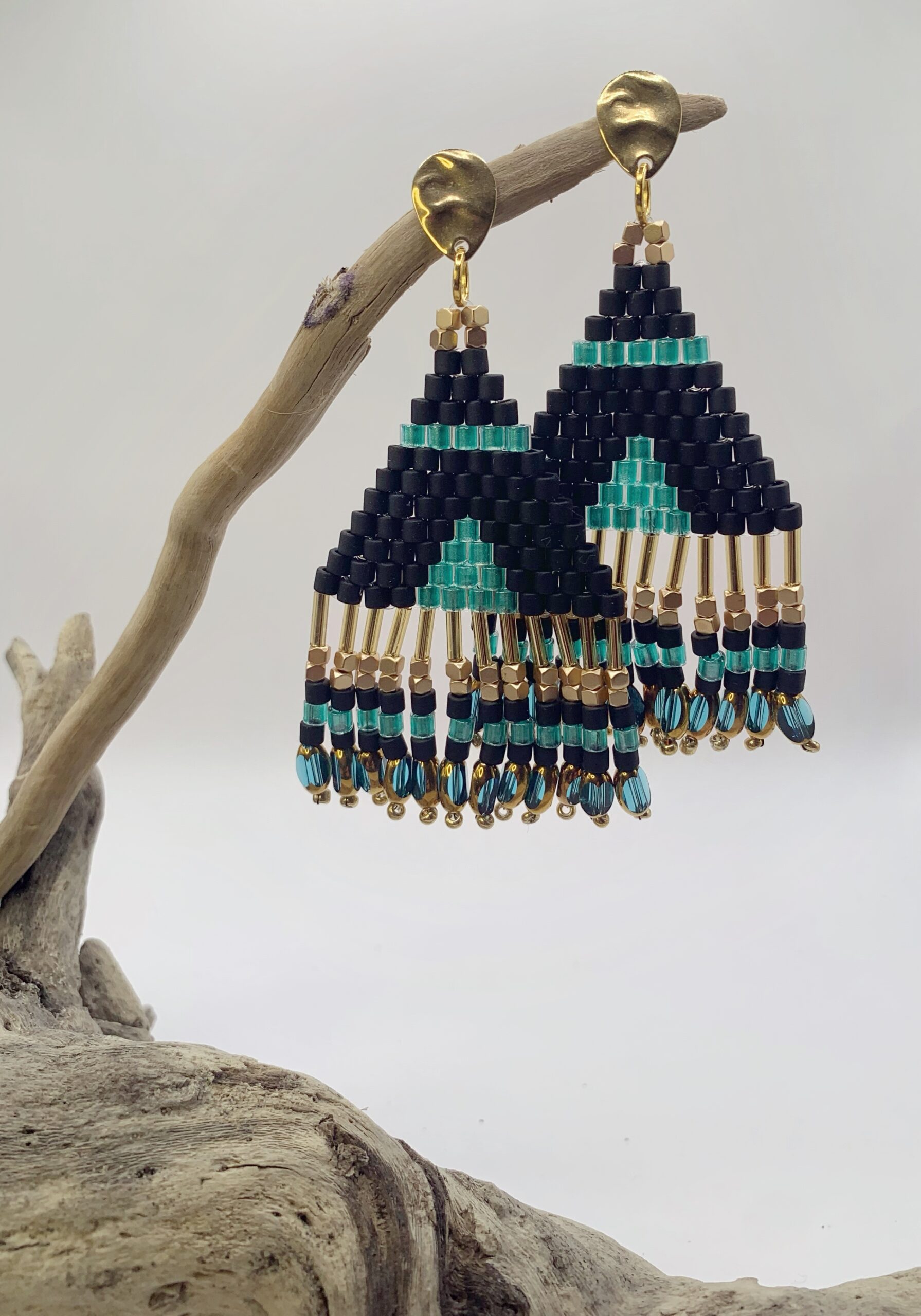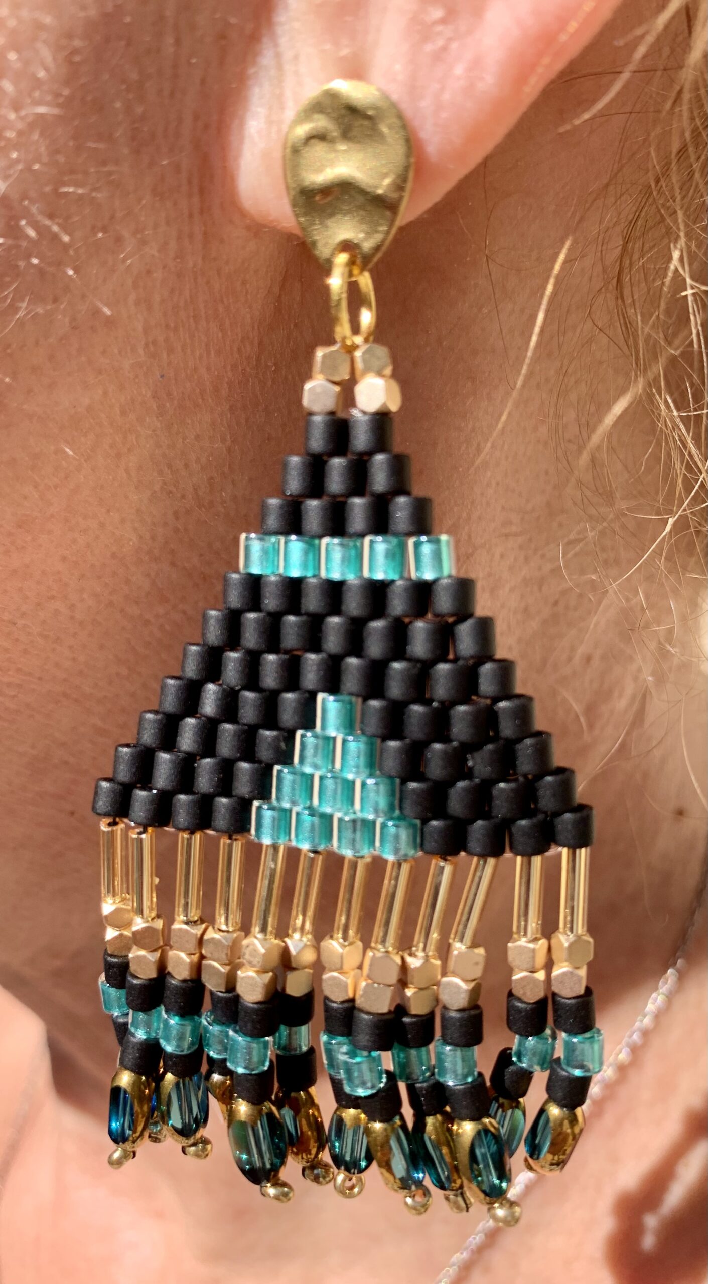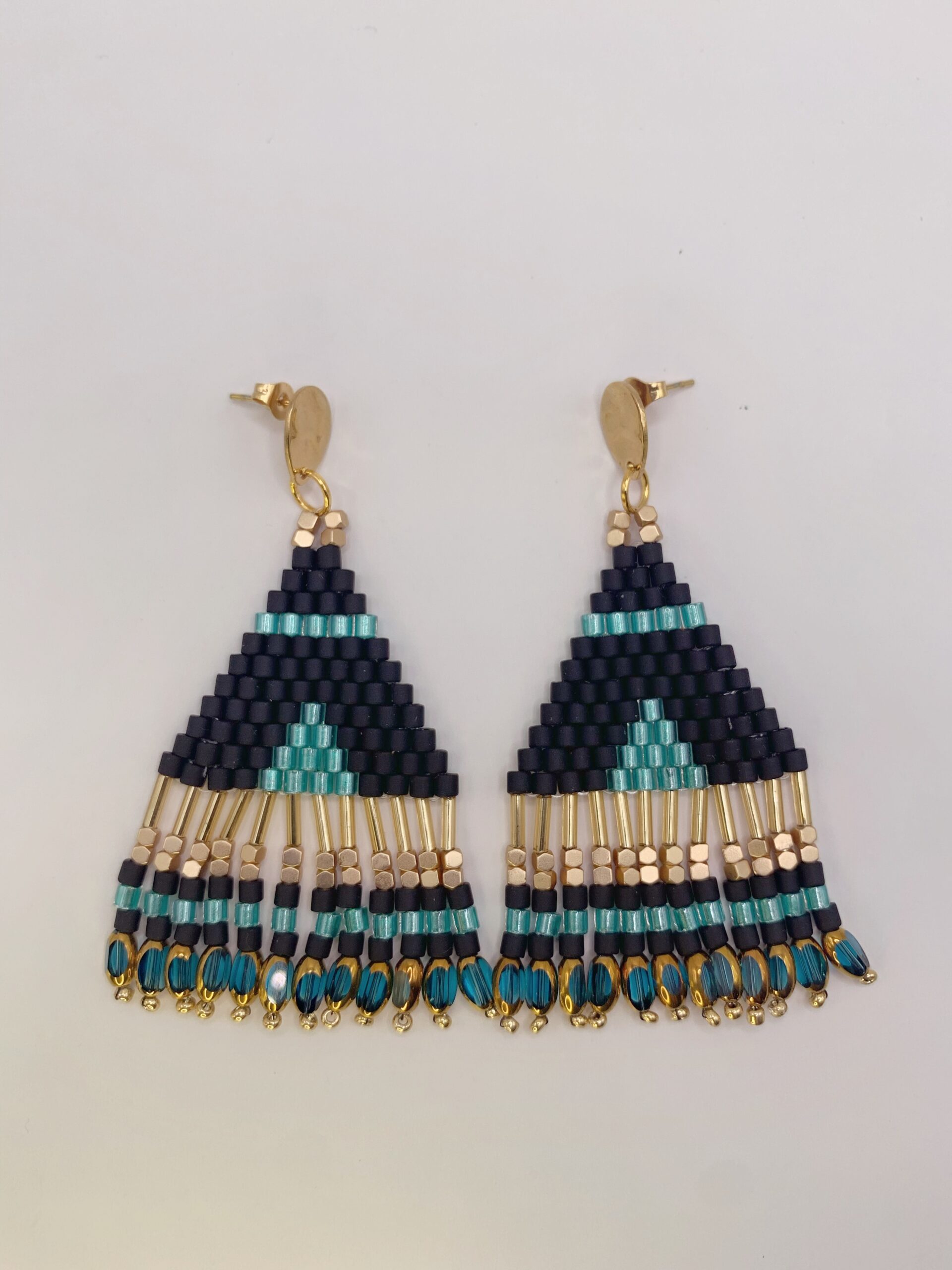 Ces magnifiques boucles d’oreilles triangulaires tissées à la main en très jolies perles miyuki délice dans des tons noirs , turquoises et dorés vont venir sublimer vos tenues.
