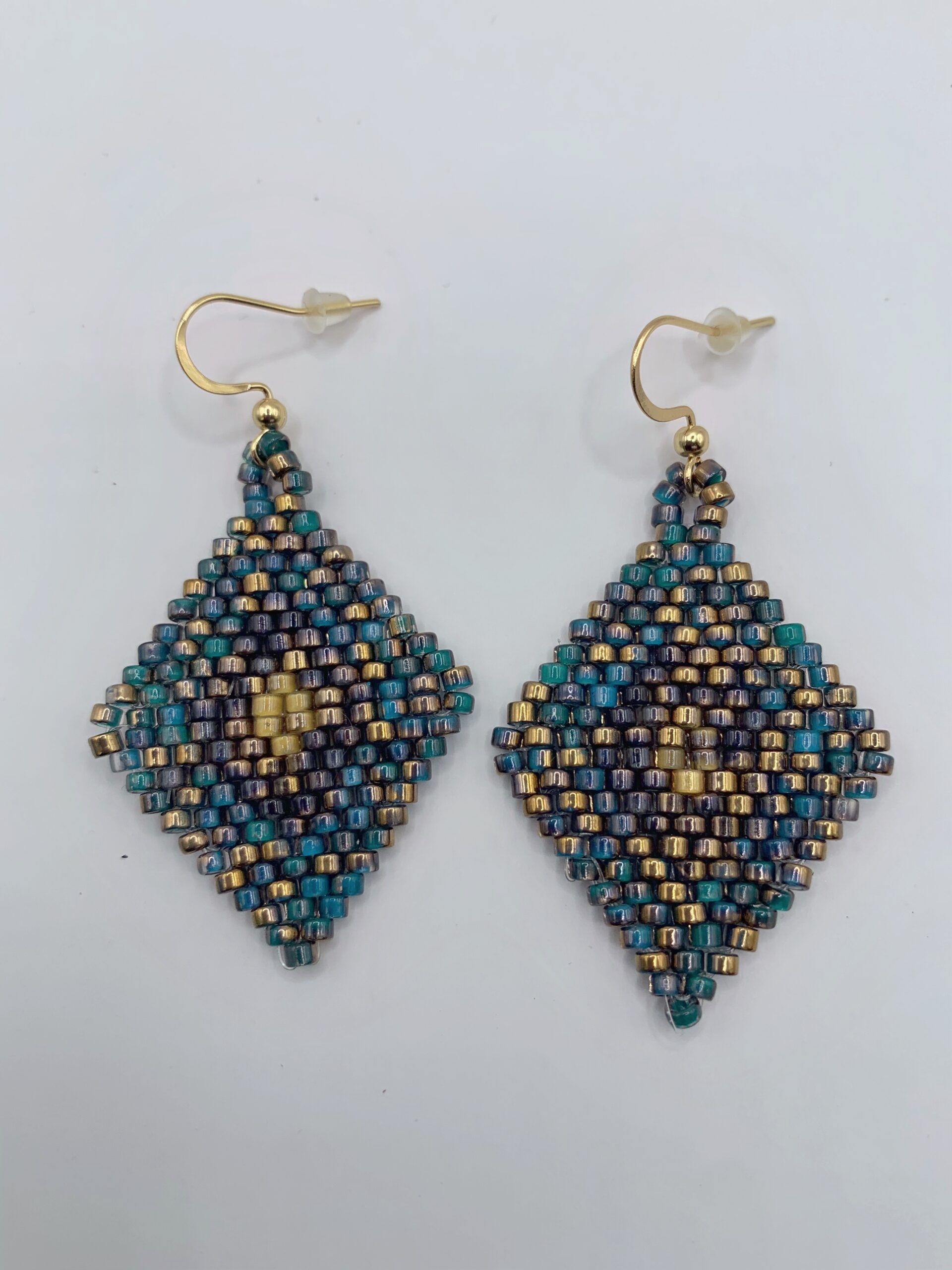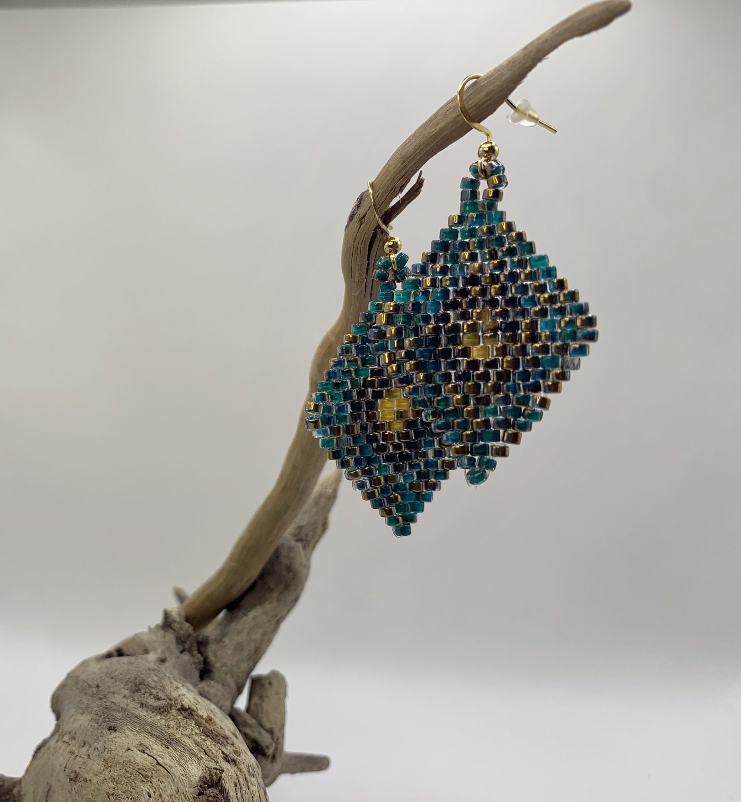 Il m’a fallu plusieurs heures pour confectionner ces jolies boucles d’oreilles tissées en perles de rocaille. Je les trouve élégantes avec des couleurs majoritairement dans les tons bleus, elles s’accorderont avec toutes vos tenues.