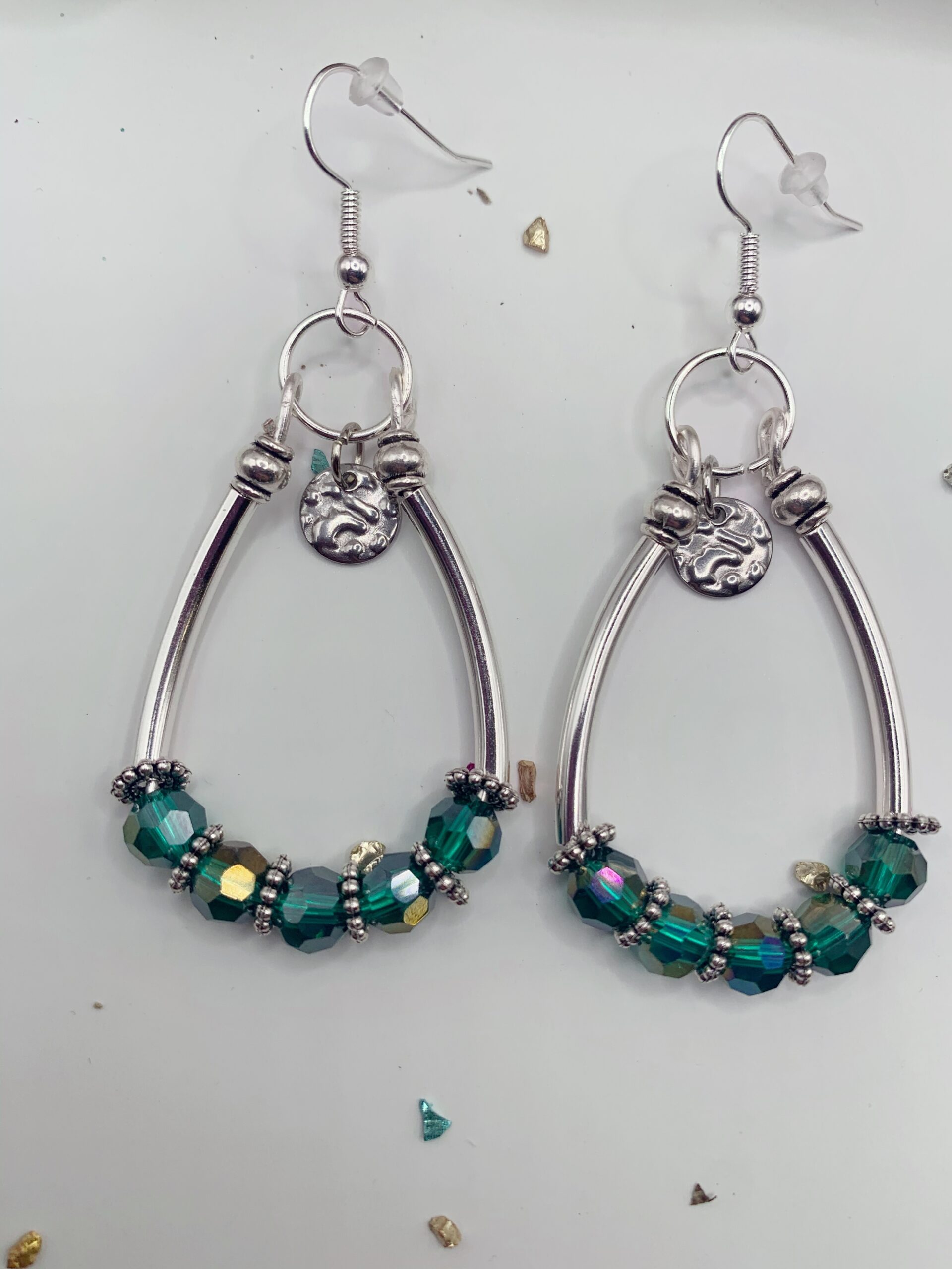 Apportez une touche de fraicheur et d’élégance à votre style avec ces magnifiques boucles d’oreilles artisanales. Elles présentent une structure en forme de goutte, composée de tubes métalliques argentés et décorée de perles facettées vert émeraude, rehaussées de petites rondelles argentées pour un effet lumineux et délicat. Un joli médaillon argenté au centre ajoute une touche originale et raffinée.