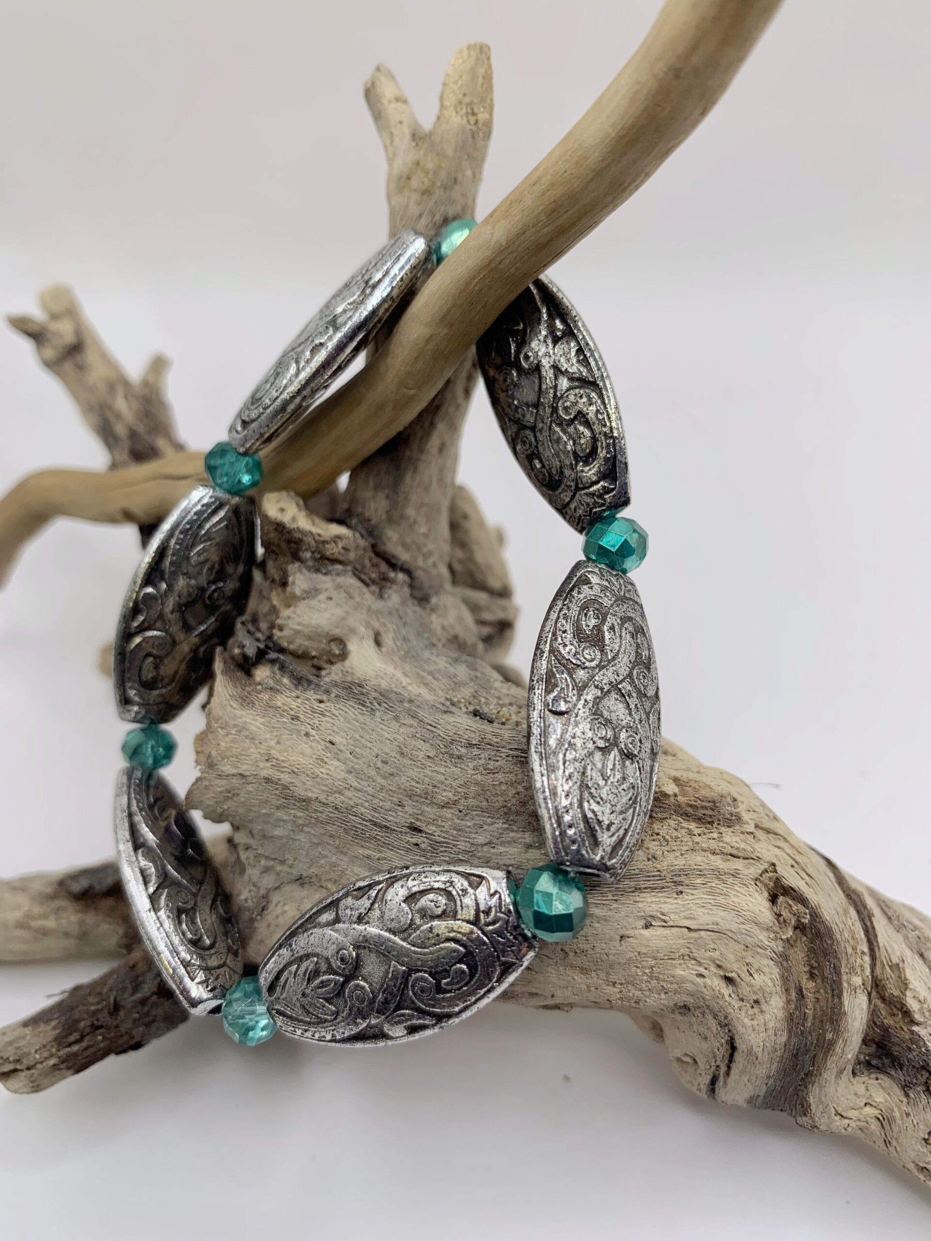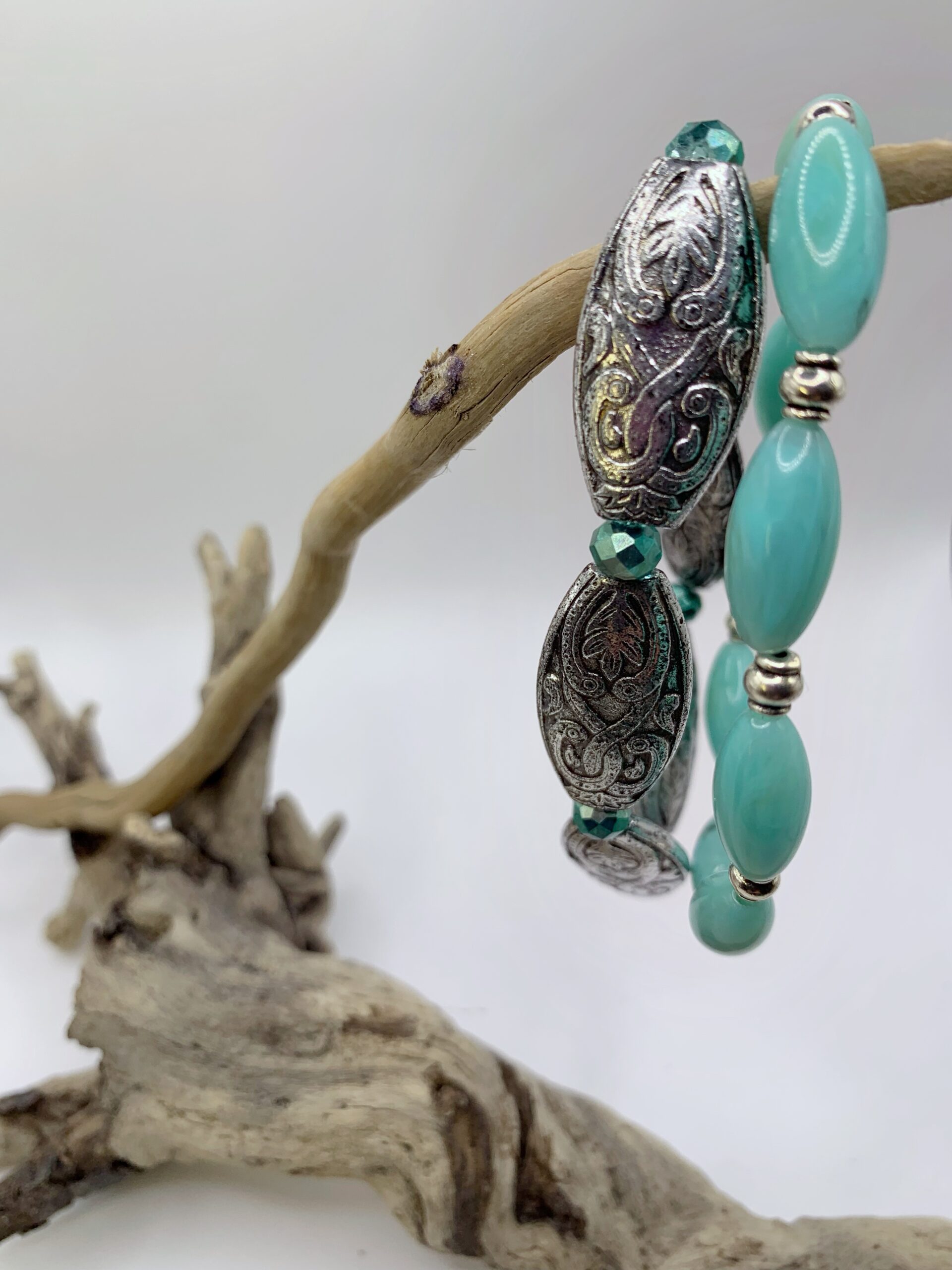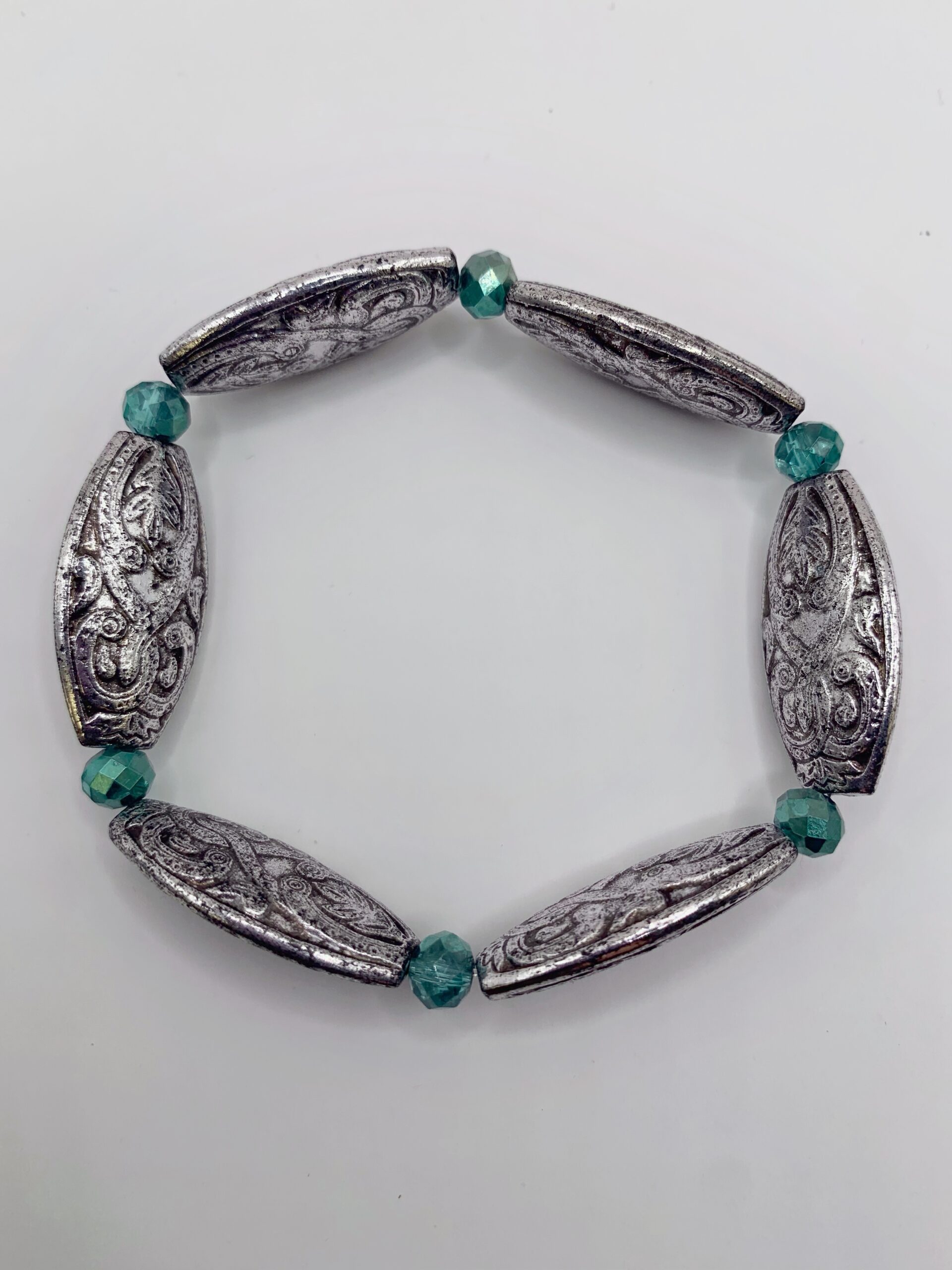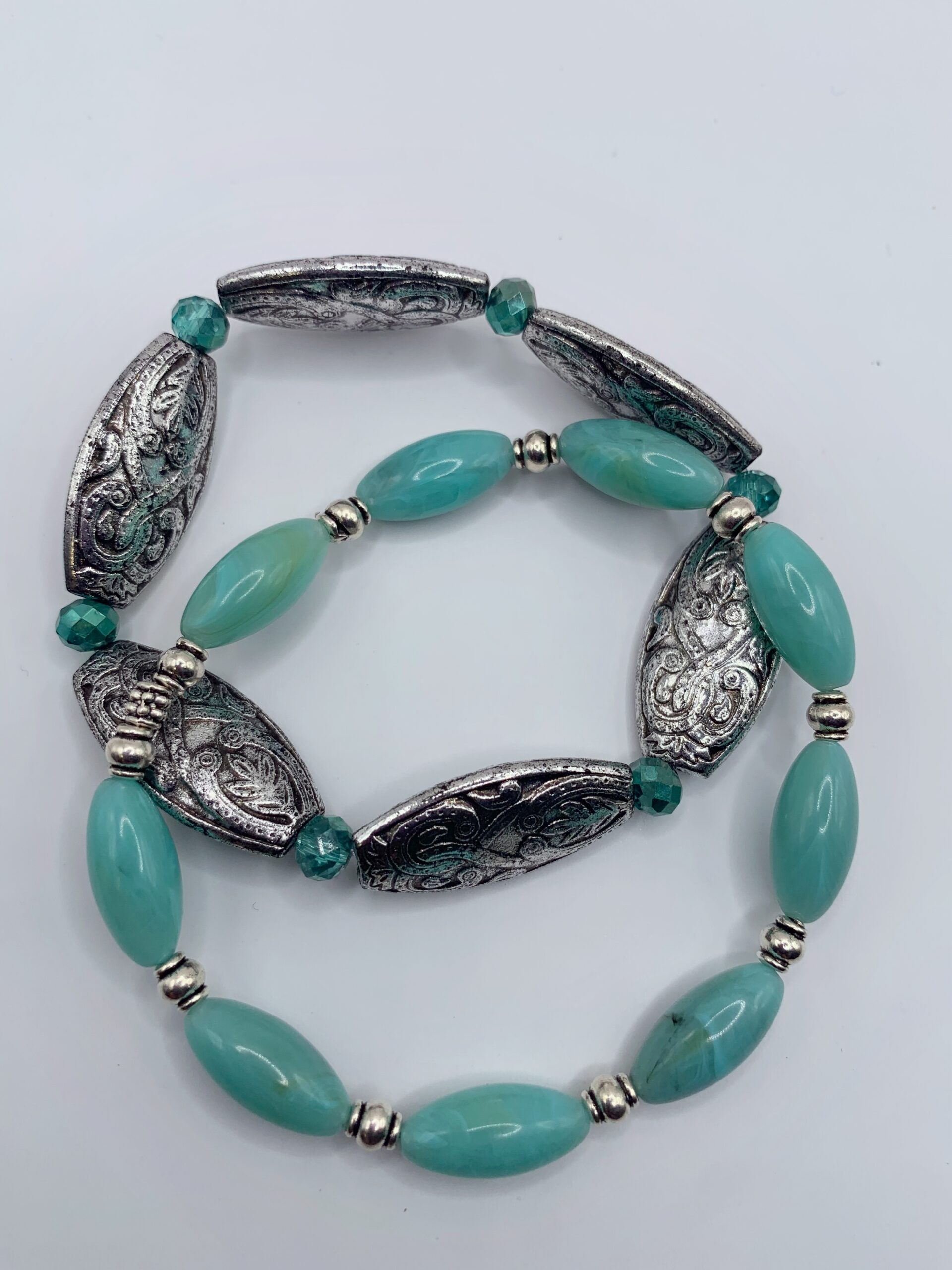 Bracelet en perles de verre et perles acrylique ornées de motifs ethniques et montées sur fil élastique, convient à tous les poignets.