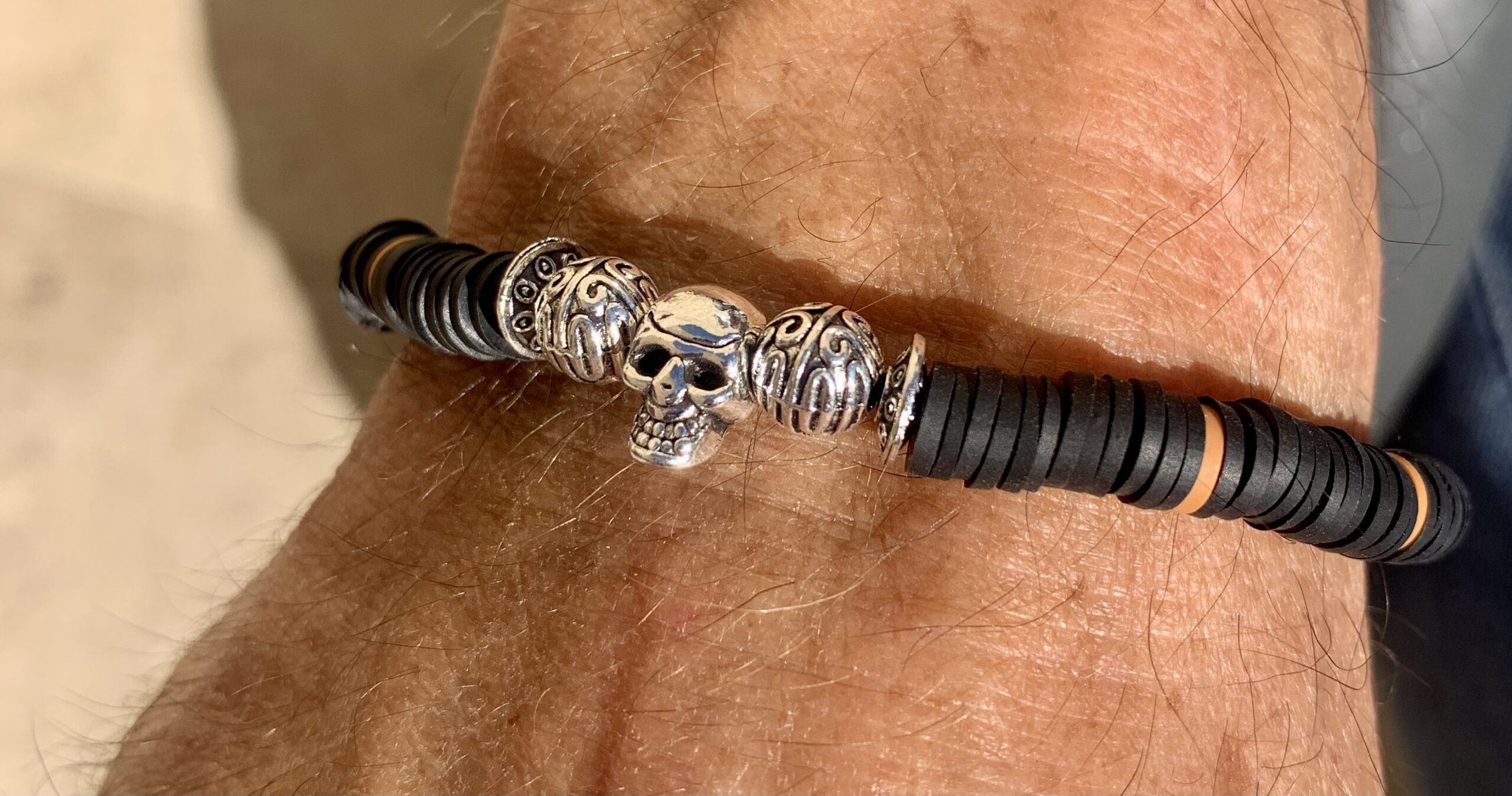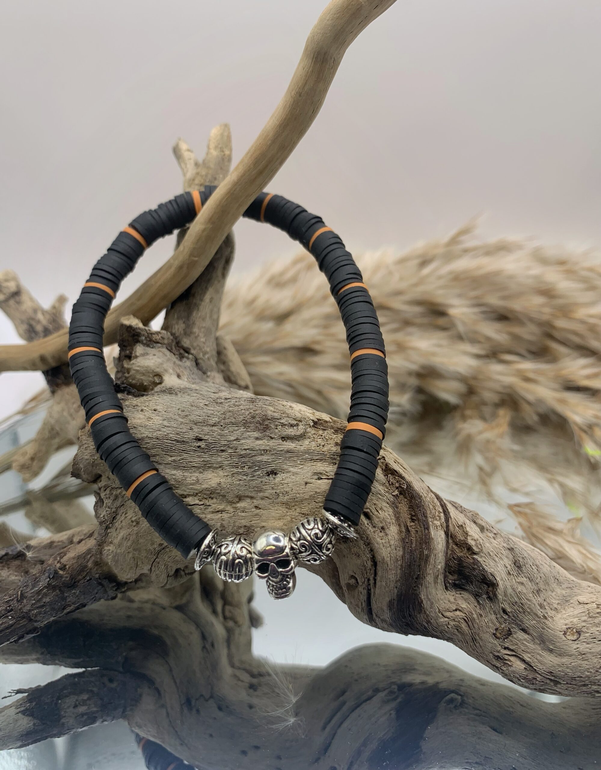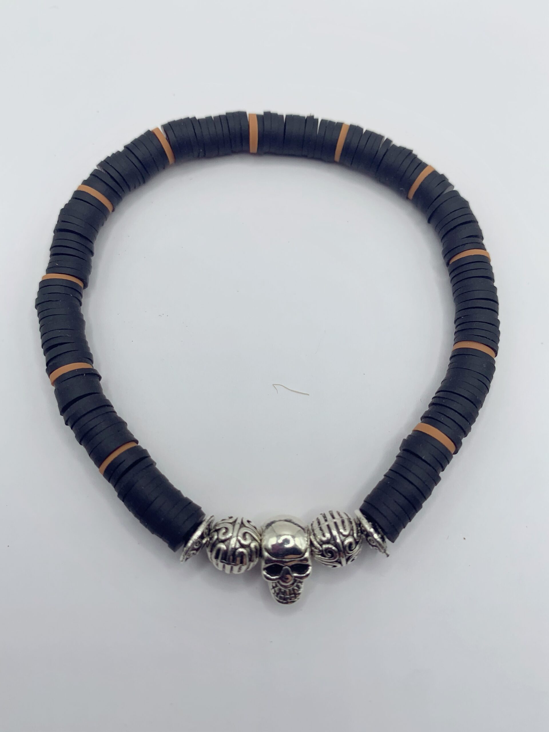 Bracelet pour hommes en argile molle de couleur noire avec breloques et crânes en métal ( alliage de zinc )