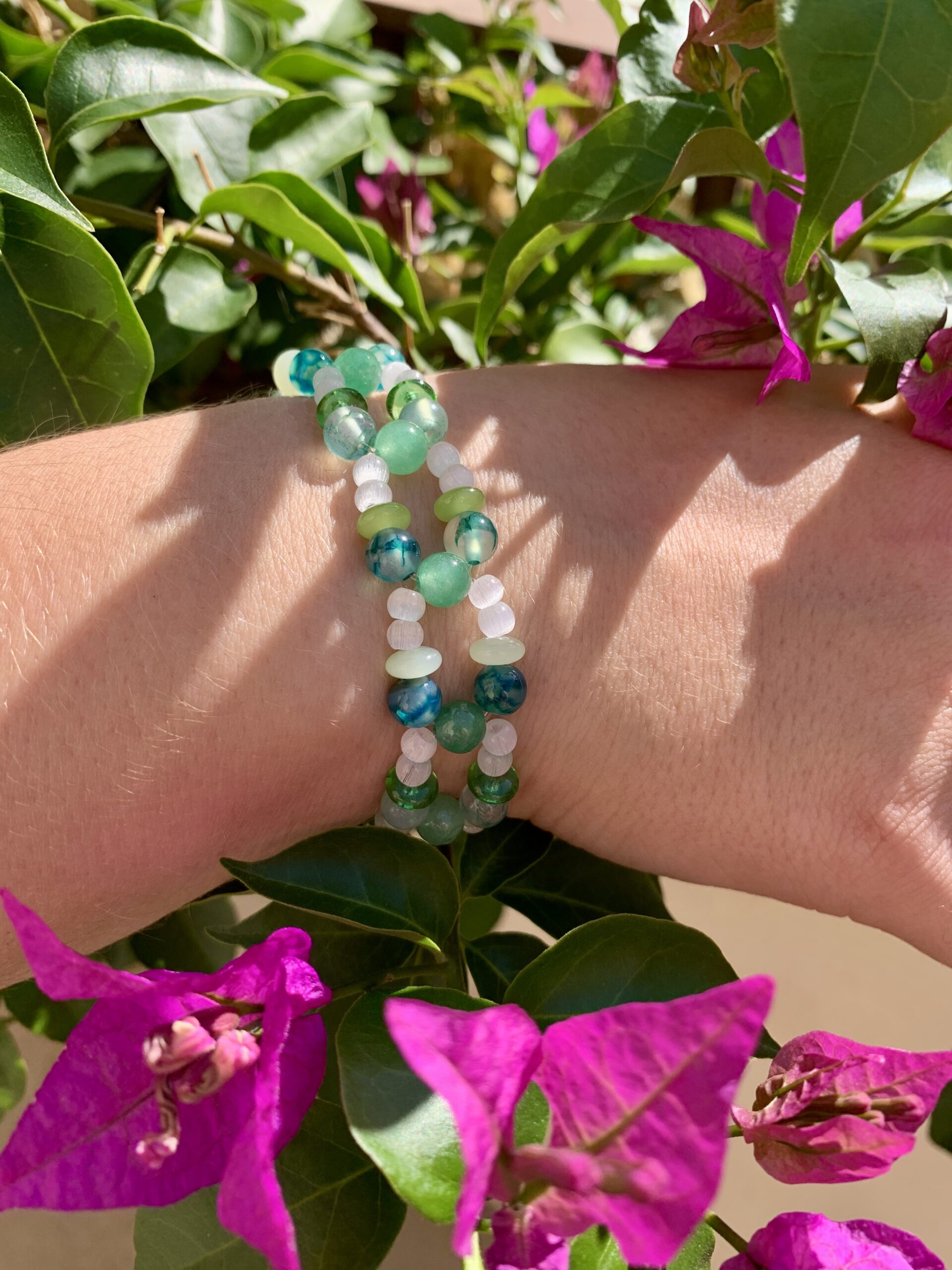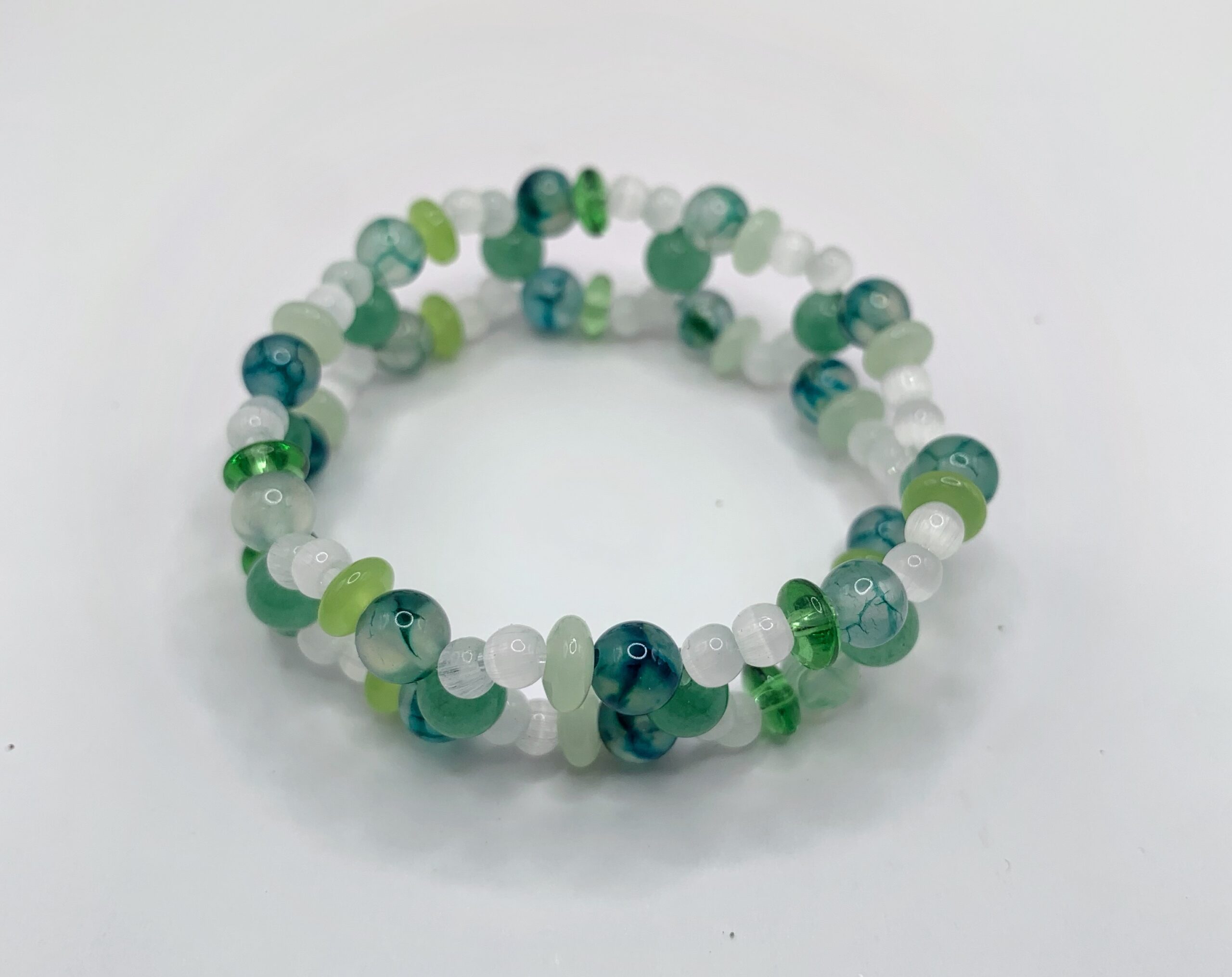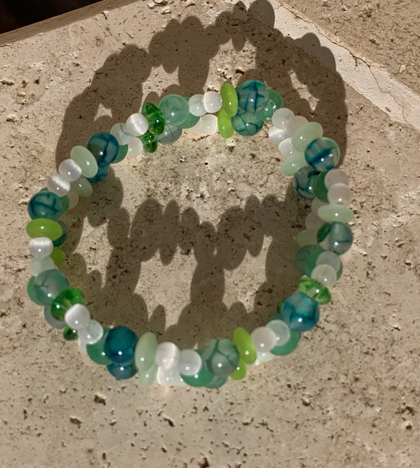 Joli bracelet élastique composé de perles naturelles de péridot, d’agates vertes et de perles de verre, fait main avec soin, s’adapte facilement à la taille du poignet ( de 16 cm ) grâce à son fil élastique.