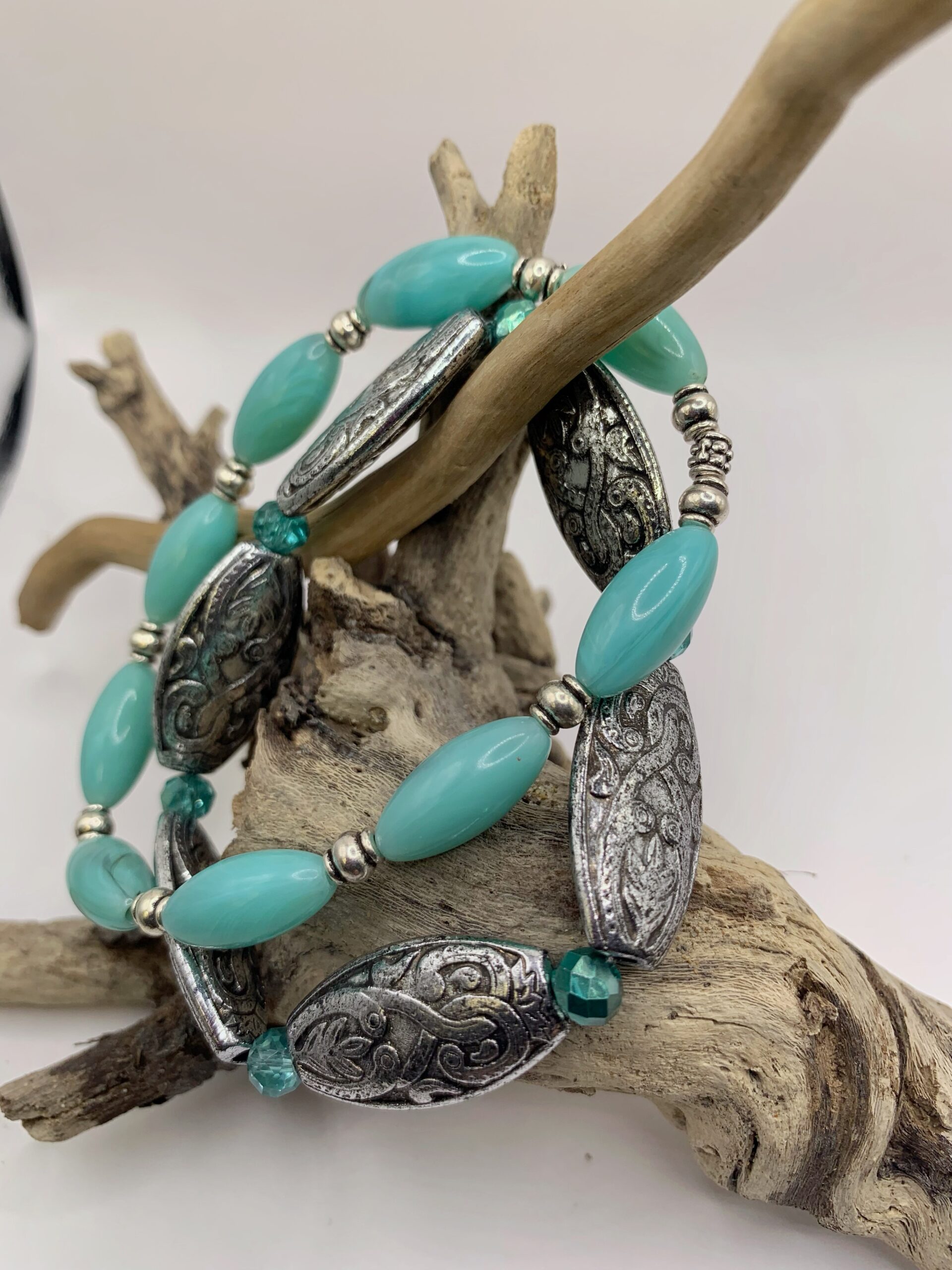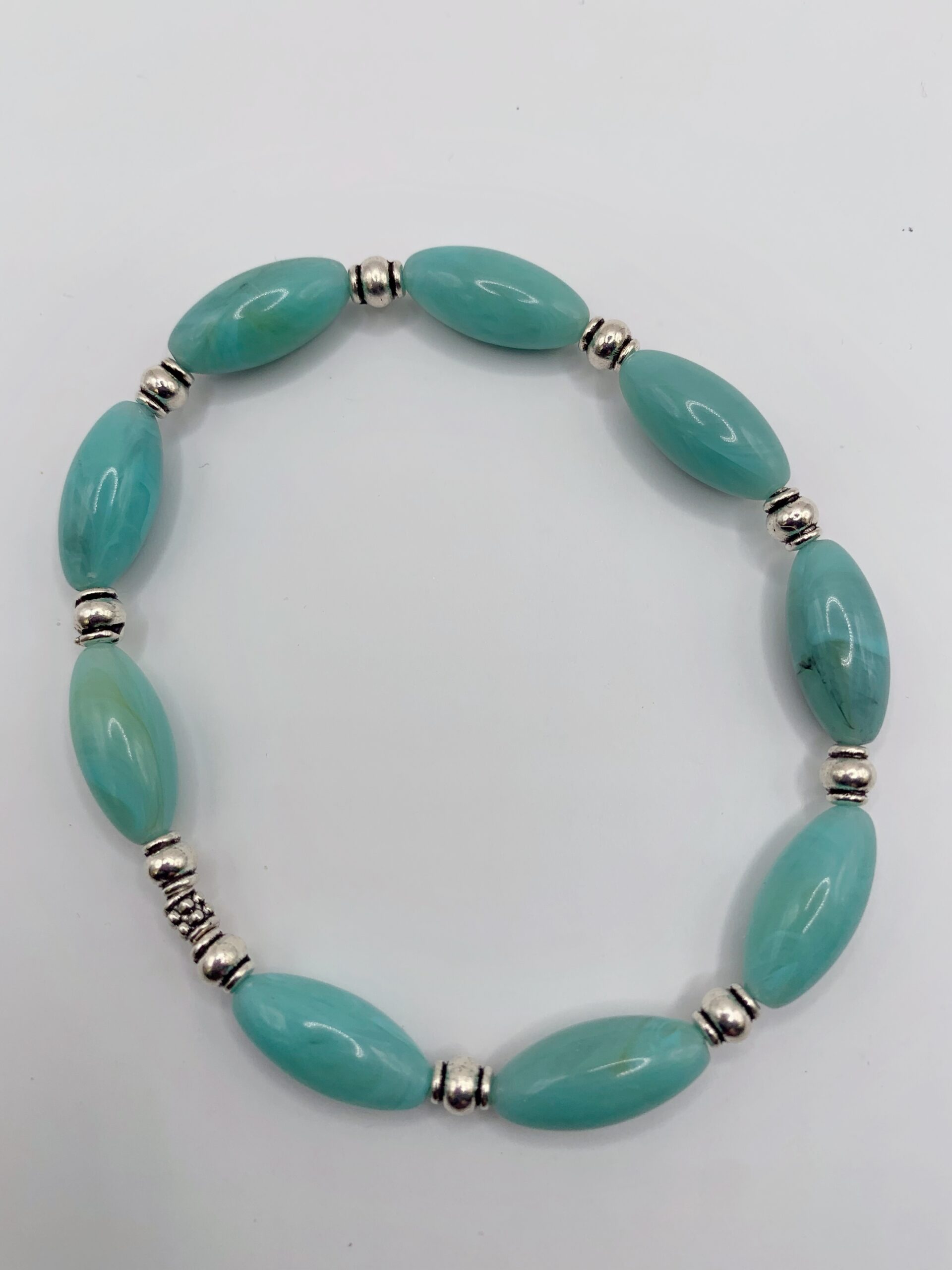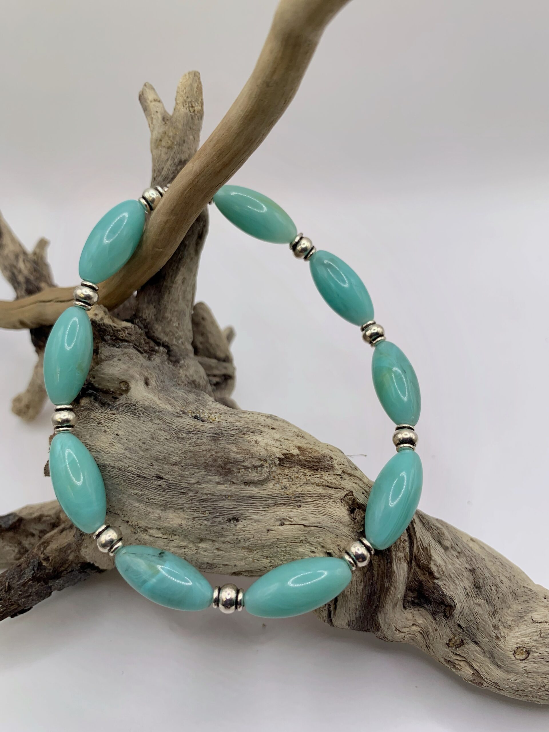 Laissez-vous séduire par l’élégance naturelle de ce bracelet en perles d’Amazonite, subtilement rehaussées de perles argentées . Chaque perle reflète des nuances apaisantes rappelant la mer et le ciel d’été, pour une touche de fraicheur et de sérénité à votre poignet.