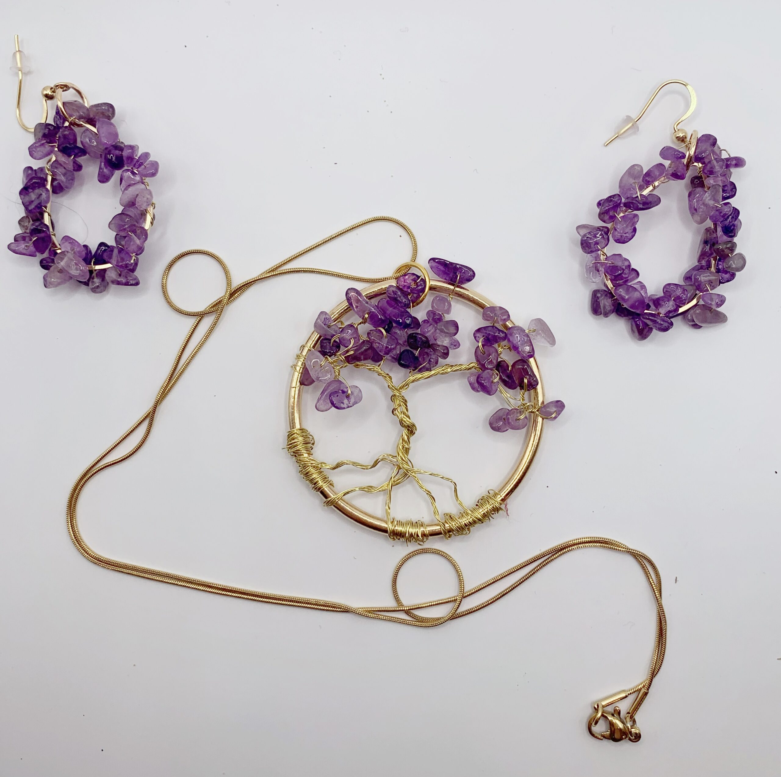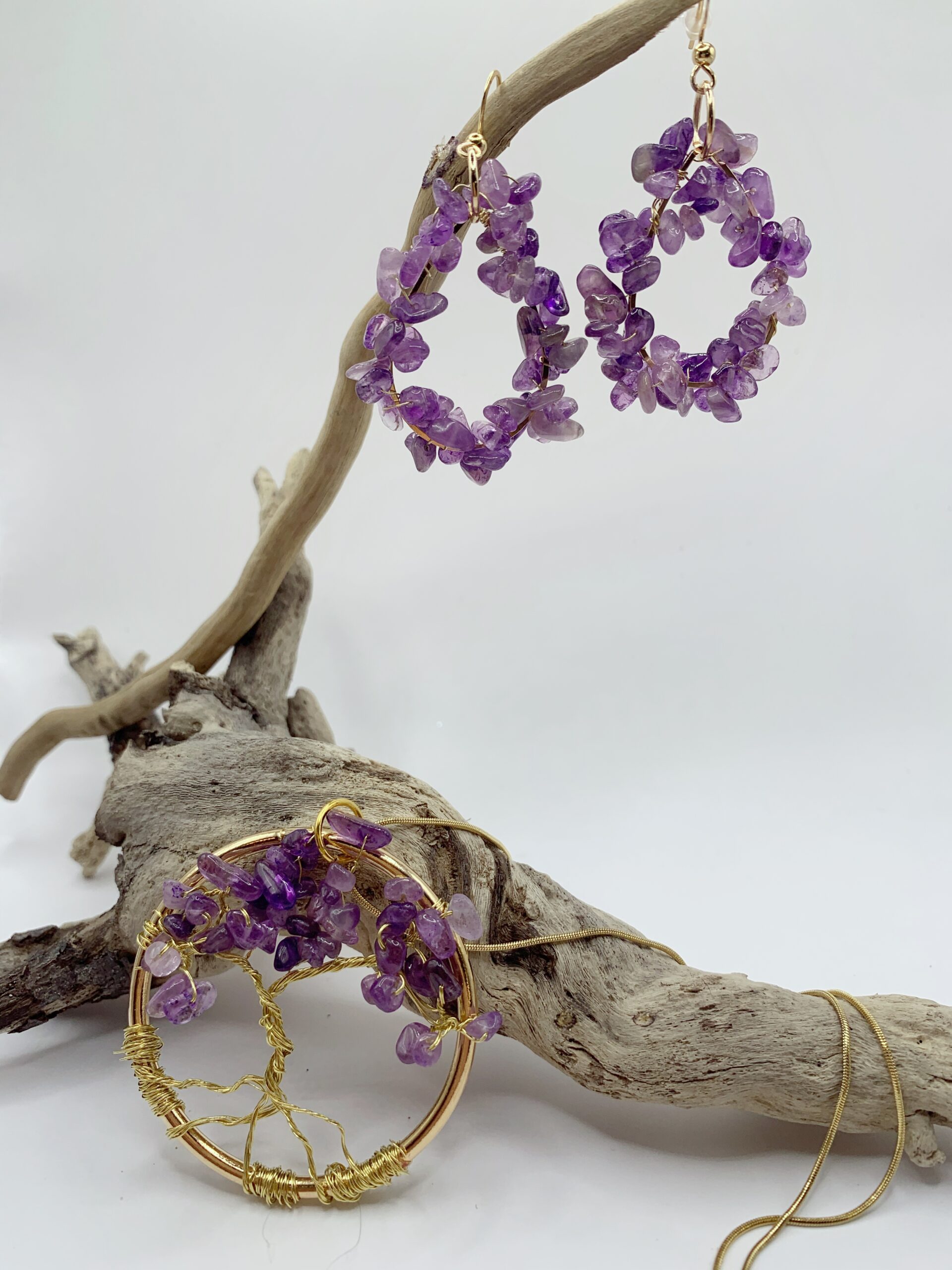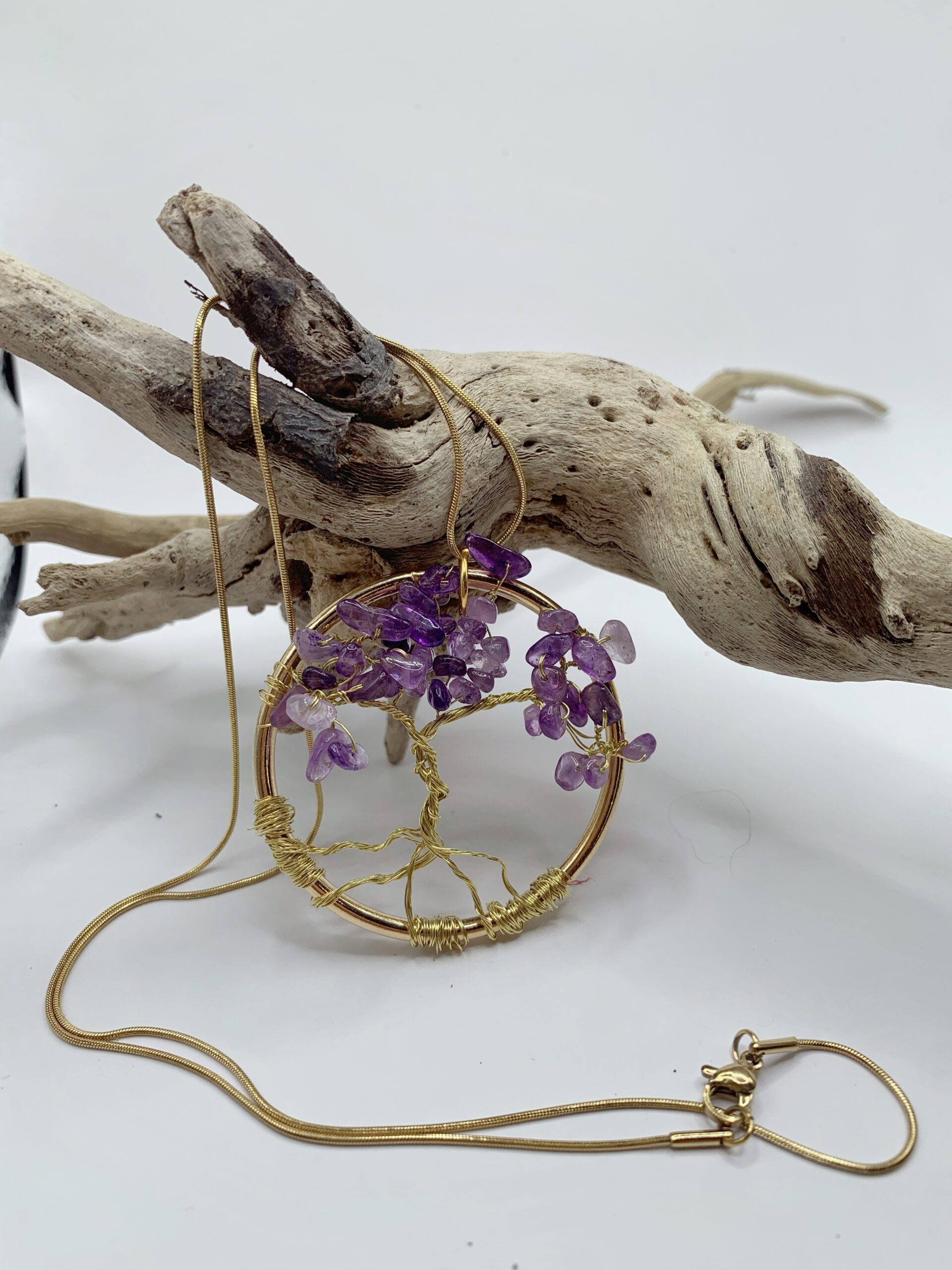 Pendentif arbre de vie en Améthyste et fil de cuivre plaqué or 18 carats, diamètre 5 cm , chaîne serpent plaquée or de 60 cm.