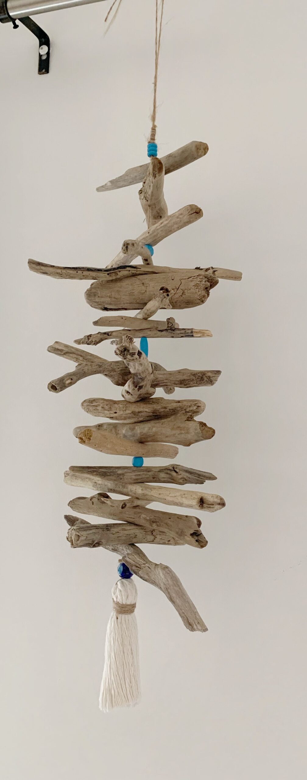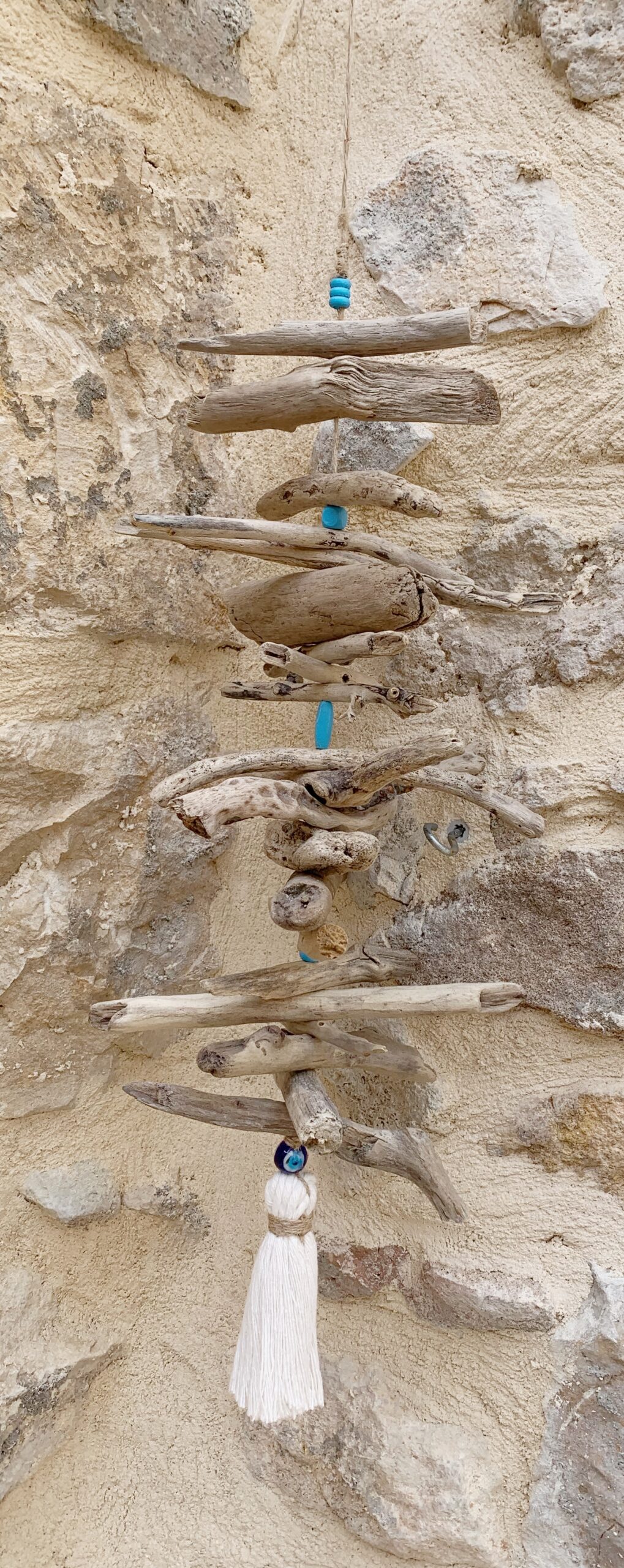 Apportez une touche naturelle et apaisante à votre intérieur avec cette suspension faite main en bois flotté de mer. Chaque morceau de bois a été soigneusement sélectionné pour sa forme unique, créant une composition harmonieuse et pleine de caractère. Les perles bleues ajoutent une note colorée et lumineuse, le papille en coton apporte une finition élégante et bohème tandis que la perle d’oeil de protection grec éloignera le mauvais oeil de votre maison. Cette suspension peut-être accrochée au mur, à une porte ou près d’une fenêtre.