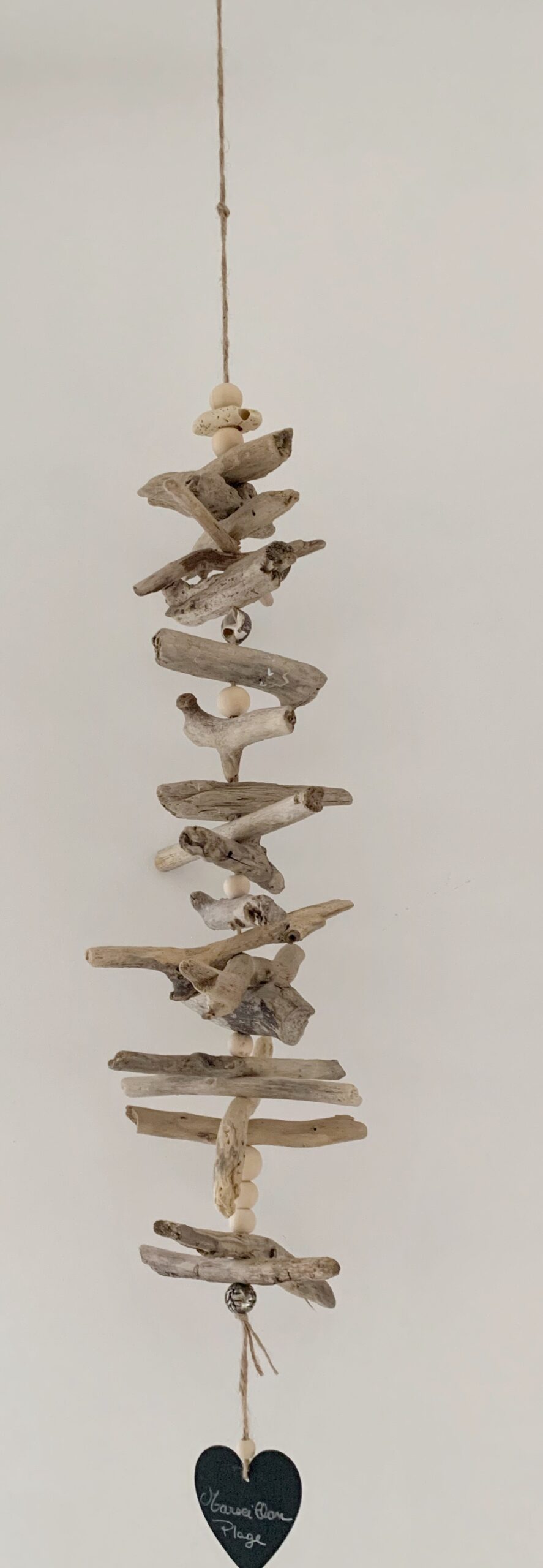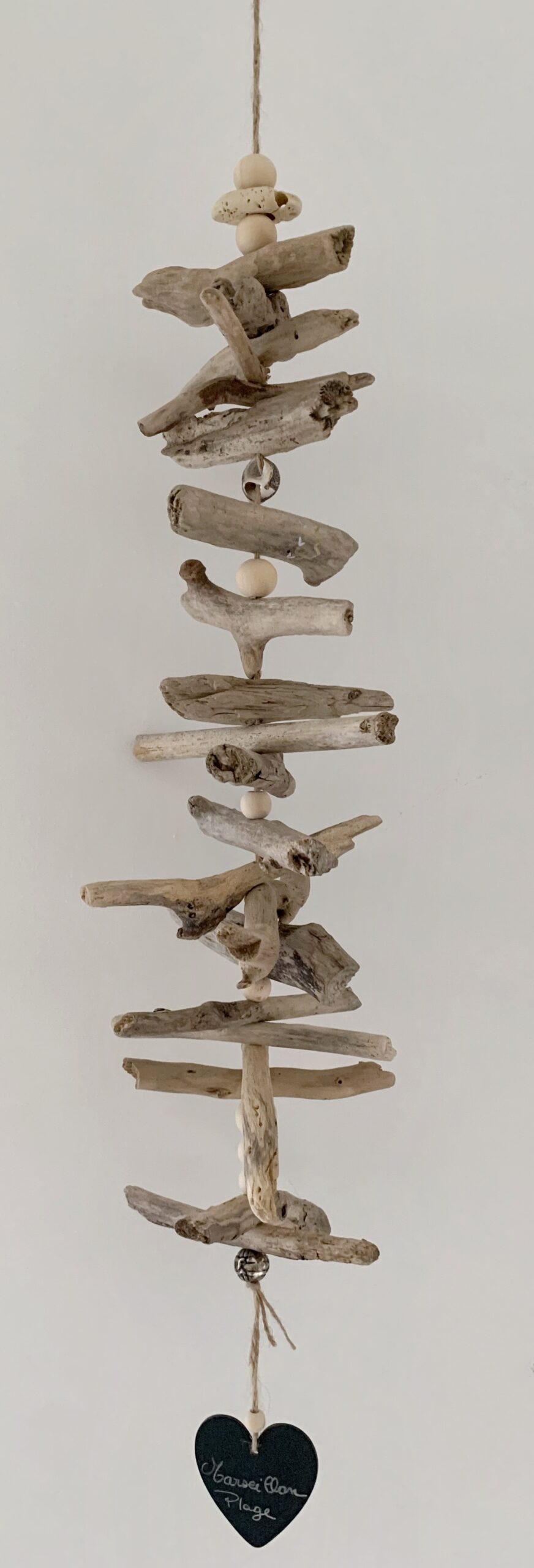 Un souffle marin pour votre intérieur ! Chaque morceau de bois, patiné par la mer Méditerranée, a été soigneusement choisi pour sa forme et sa texture uniques, créant une pièce à la fois rustique et élégante. Les perles en bois clair et le petit coquillage ajoutent une douceur naturelle à l’ensemble, tandis que le petit coeur suspendu « Marseillan plage » apporte une note charmante et personnalisée.